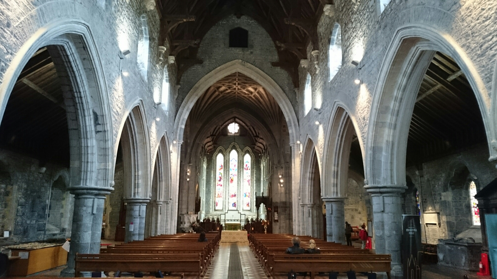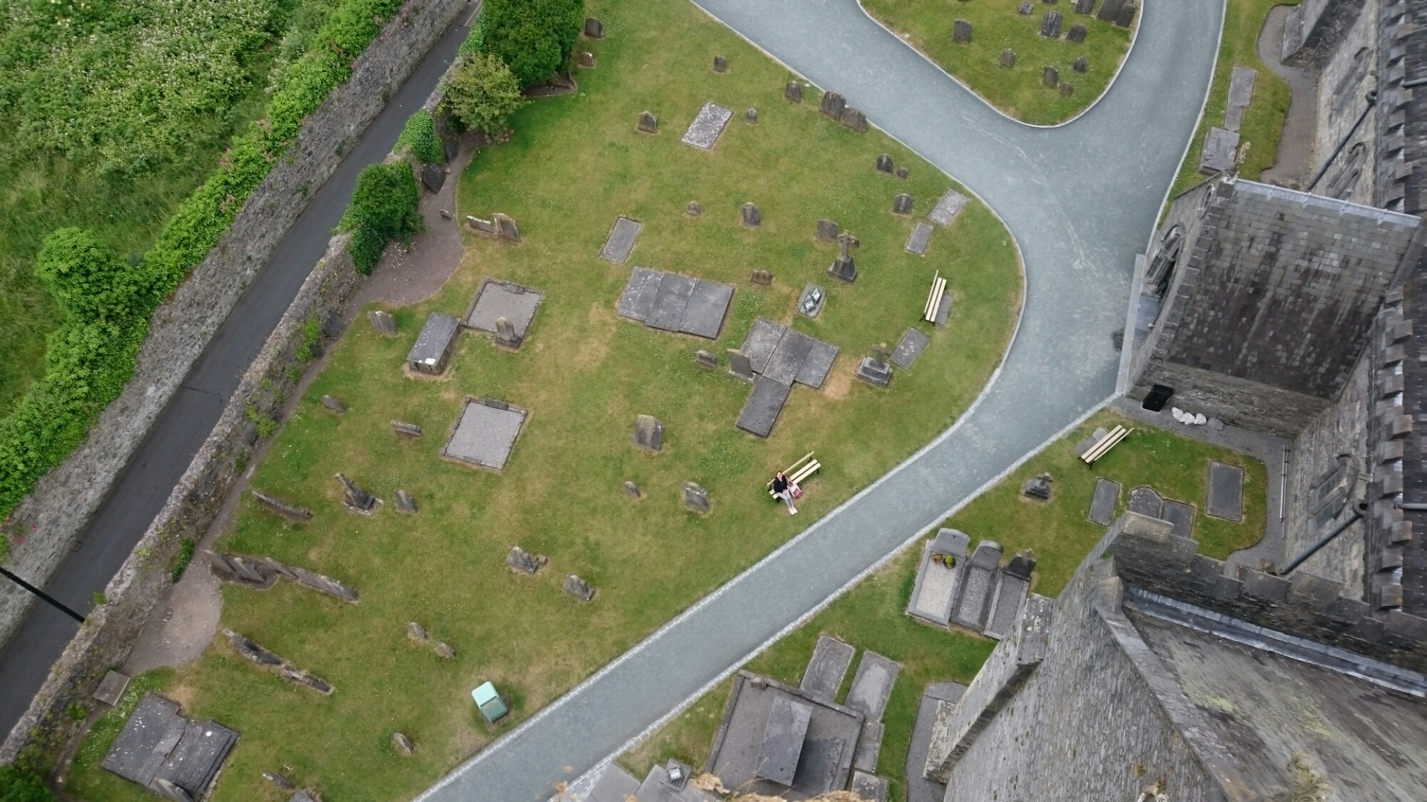 Vi spiser godt. Sover litt ujevnt – på ett av rommene var det visstnok et spøkelse i natt… Idag har vi nok en gang blitt velsignet med godt vær, så hva er mer passende enn en tur til Saint Canice – den enorme katedralen. Tre av oss klatret opp trappene til Castle Tower. Den 4., finnes på bildet under. Dette var virkelig en enorm katedral – en av Irlands to største. By the way – Kilkenny var hovedstaden i Irland, en middelalder siden…