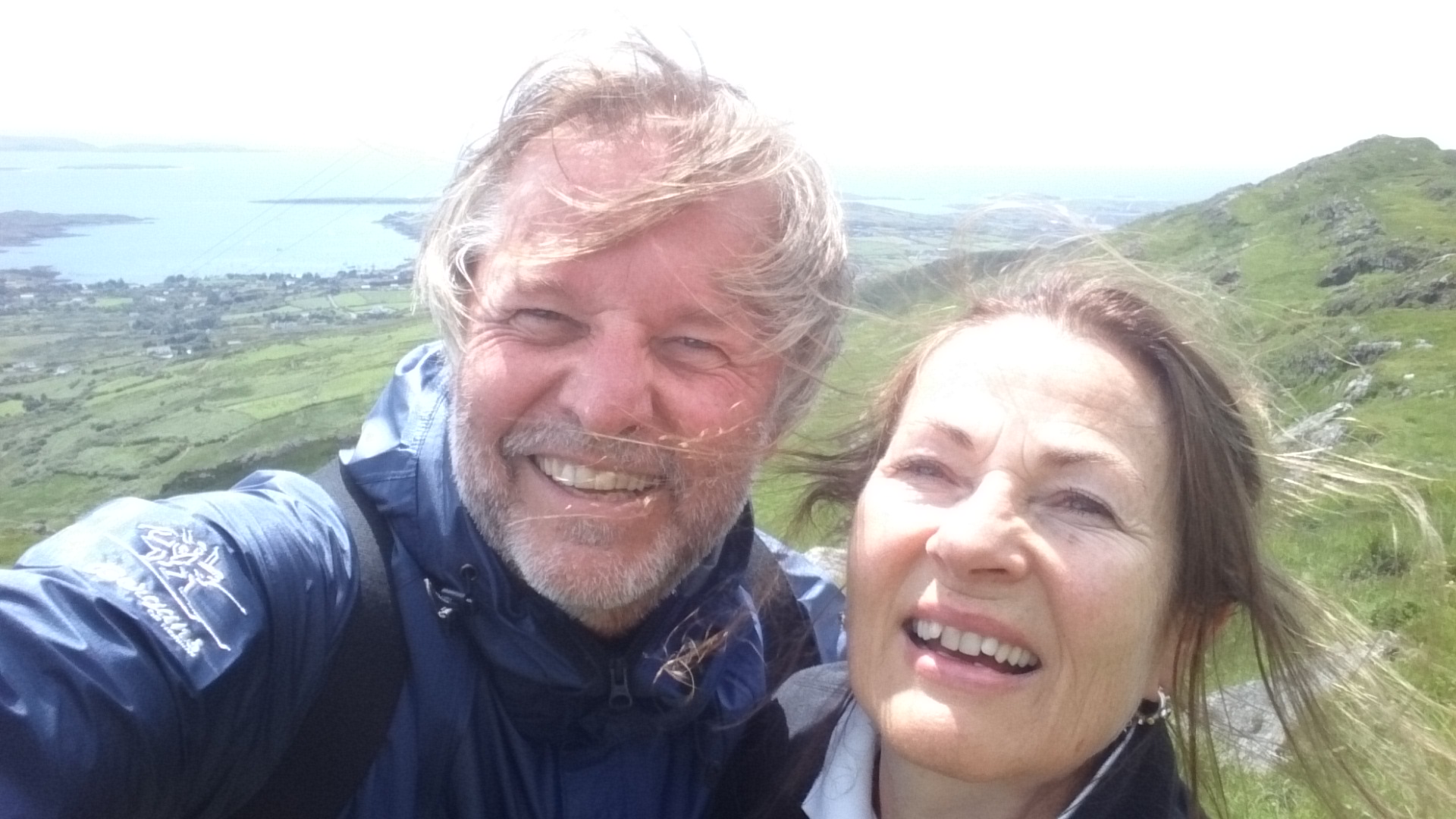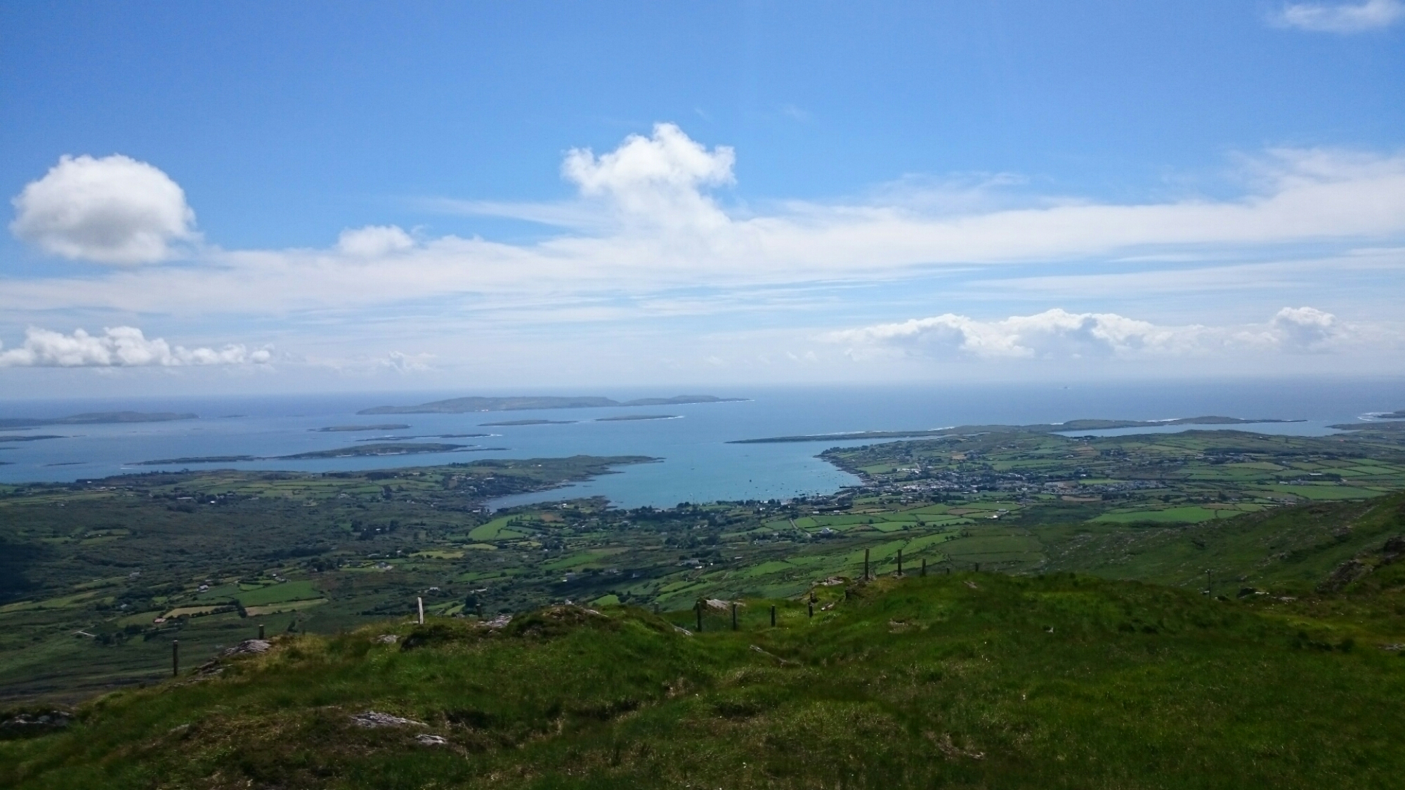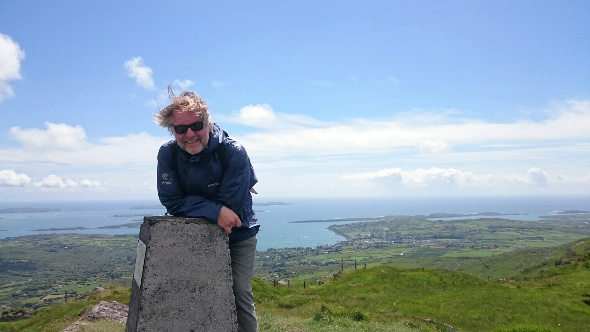 Søndagstur til Mt Gabriel. Ikke mer enn 400 meter + over havet, men det høyeste fjellet i området her. Over myr og beite, via sau, mistenkelige flokker av ku, insekter og pene småblomster – opp, opp – tre timer senere var det sjokolade på toppen.