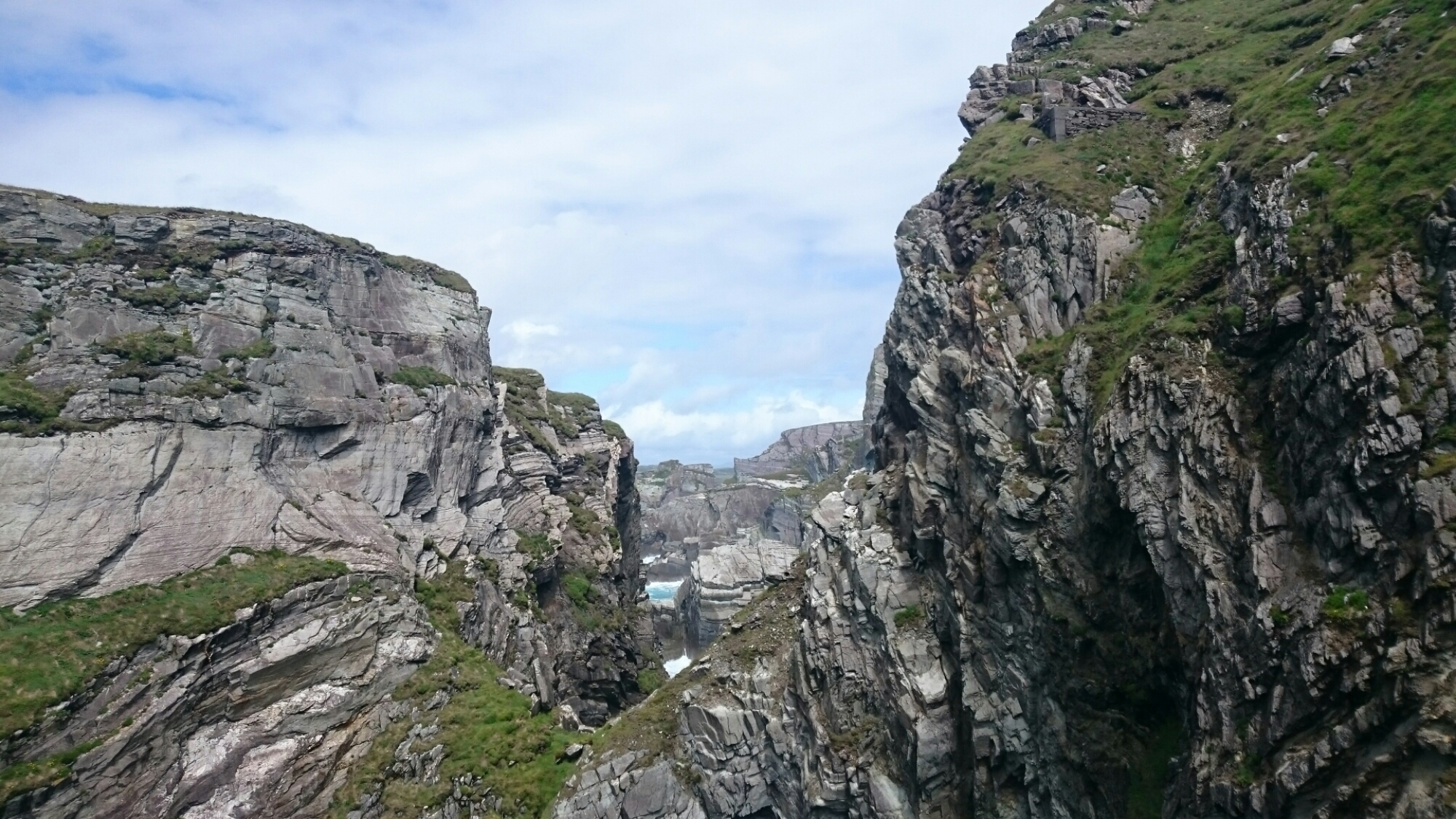 Vi tok omveien til Schull. Veien kravler seg opp og frem helt ytterst i havgapet. Vi må stoppe mange ganger for å ta bilder, og bare se. Ytterst ute i horisonten kunne vi se seilbåter som gynget opp og ned i dønningene.